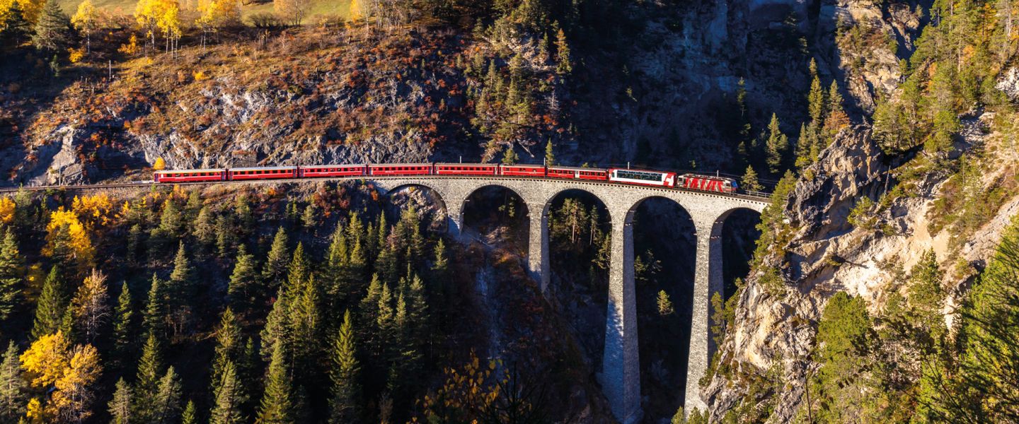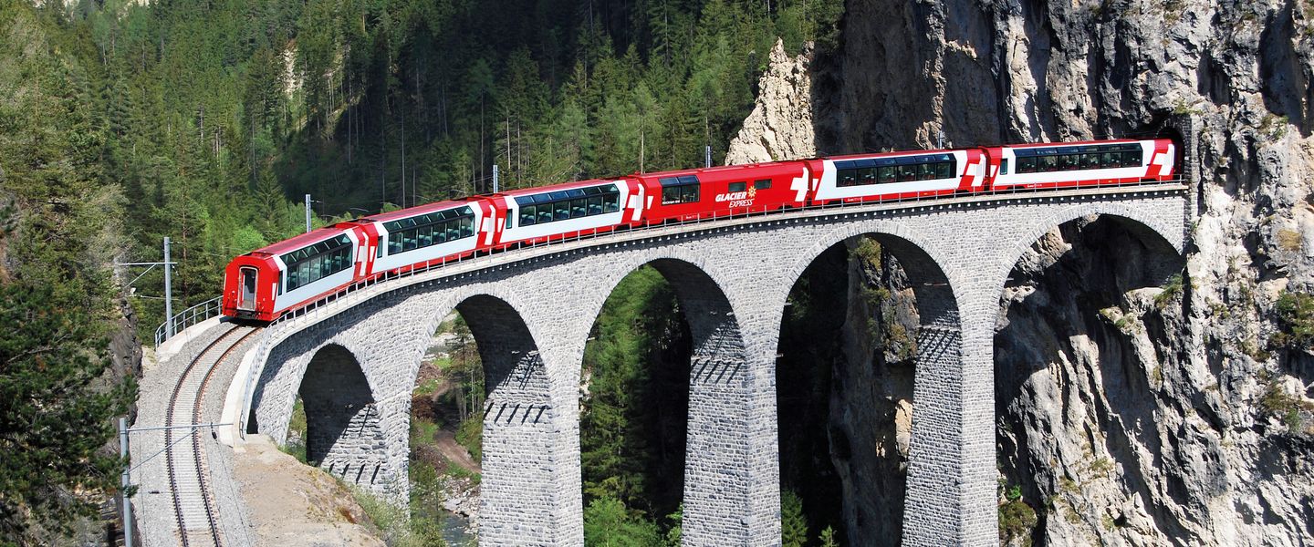 Genießen Sie das Alpenpanorama der Schweiz mit einem einzigartigen Zugerlebnis. Wilde Schluchten, liebliche Täler, kühn gebaute Bahntrassen, spektakuläre Viadukte und Kehrentunnel begleiten Sie während der Zugfahrten auf den Strecken vom Bernina- und Glacier Express.